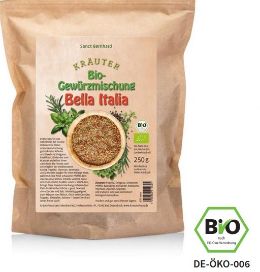 Oregano, basiilik, koriander ja majoraan annavad teie roogadele Vahemere köögi värskuse ja kerguse. Vürtsikust lisavad paprika, tüümian, rosmariin ja sibul. Näpuotsatäis musta pipart viimistleb kogu segu maitsete buketti. Maitseainesegu „Bella Italia” on ilma kunstlike lisanditeta ja 100% maheviljelusest pärit koostisosadega , mis toob Itaalia hõngu otse teie kööki – teadlikult on see valmistatud ilma suhkru ja soolata. Mitmekülgne maitsesegu sobib liha, kala, köögiviljade, suppide, hautiste ja salatite maitsestamiseks. Laske oma ideedel lennata!